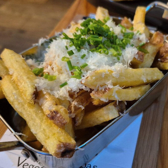 Handcut fries with truffle oil, grana padano cheese (or vegan cheese) & chives