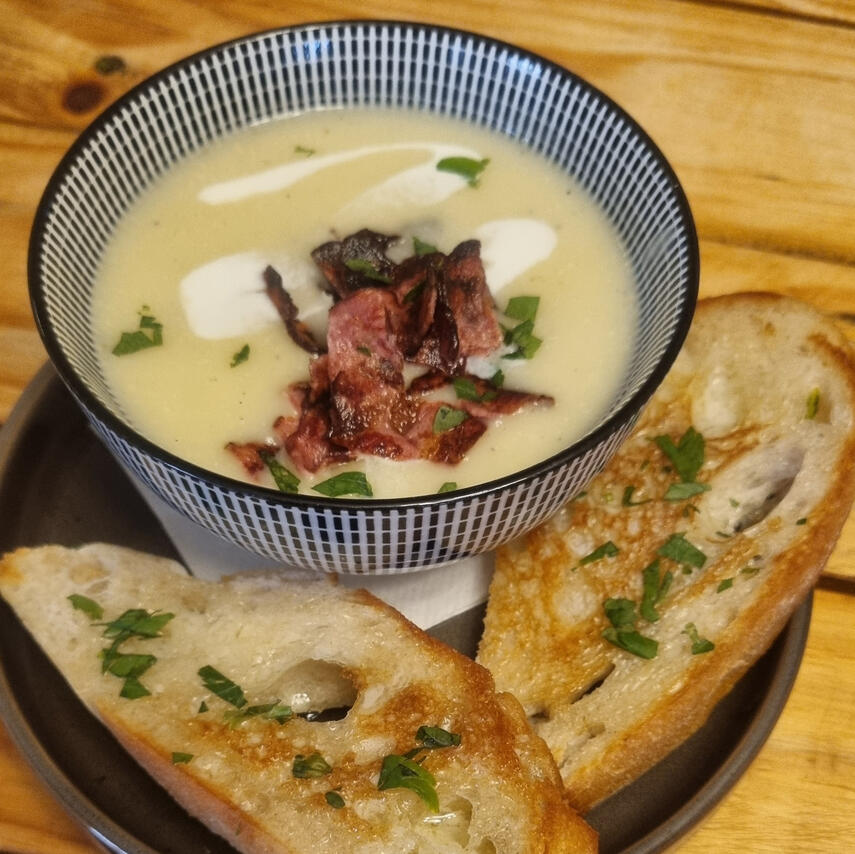 Classic French potage Parmentier soup topped with chives (& optional crispy presunto), served with focaccia bread.