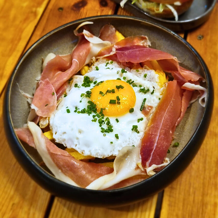 Classic Portuguese dish of cured Iberian ham on a bed of hand-cut fries, topped with a fried egg