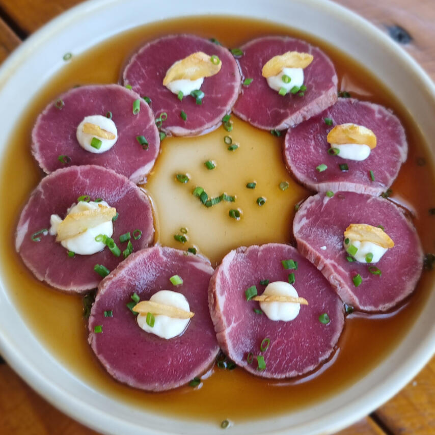 Japanese-style thin-sliced seared beef with ponzu sauce, topped with garlic mayo & crispy garlic chips