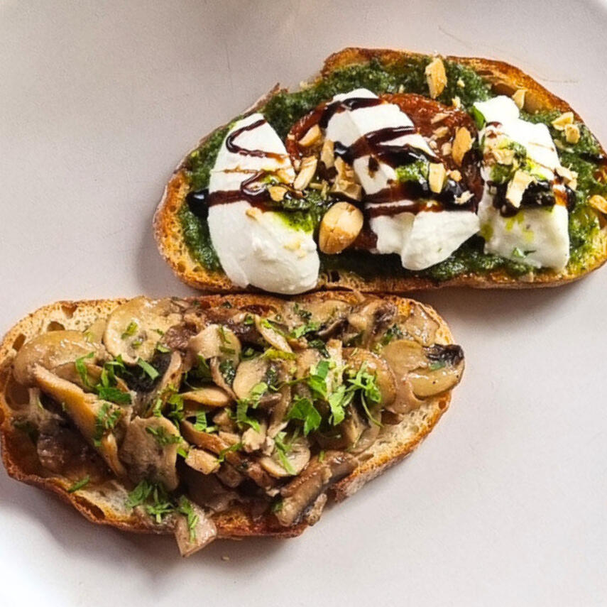 2 sourdough toasts served with your choice of: Sautéed galric mushrooms OR Mozzarella, sun-dried tomatoes & pesto