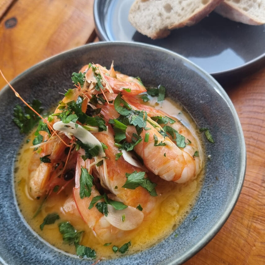 Prawns pan-friend with garlic & Portuguese vinho verde wine with a touch of piri piri, served with focaccia bread