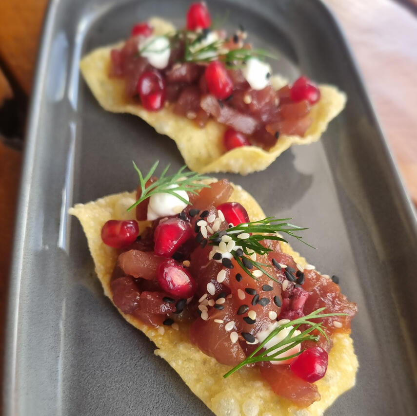 Premium tuna tartare with a spicy Asian-French dressing, served on 2 rice paper crisps