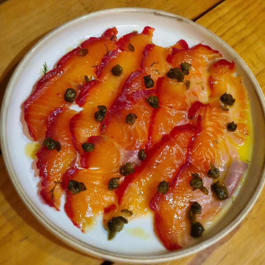 Thinly sliced Nordic-style cured Salmon, with a zesty lemon and dill dressing, and finished with a sprinkle of crispy fried capers