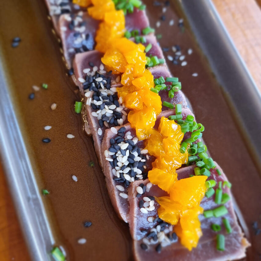 Japanese-style lightly seared tuna with house ponzu sauce, topped with mandarin, sesame seeds, dill & chives