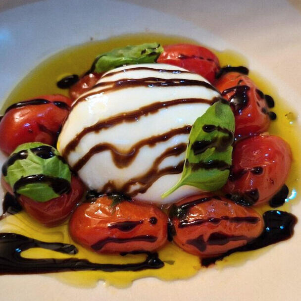 Italian-style burrata cheese & cherry tomato salad topped with basil oil & balsamic reduction