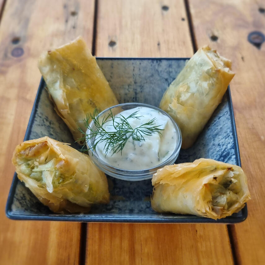 Greek-style spinach & feta wrapped in crispy filo pastry, served with a tzatziki yogurt & cucumber dip