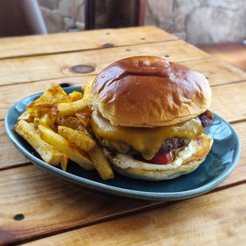 Premium Angus beef patty with bacon jam & parmesan mayo on a toasted bun, served with hand-cut paprika fries