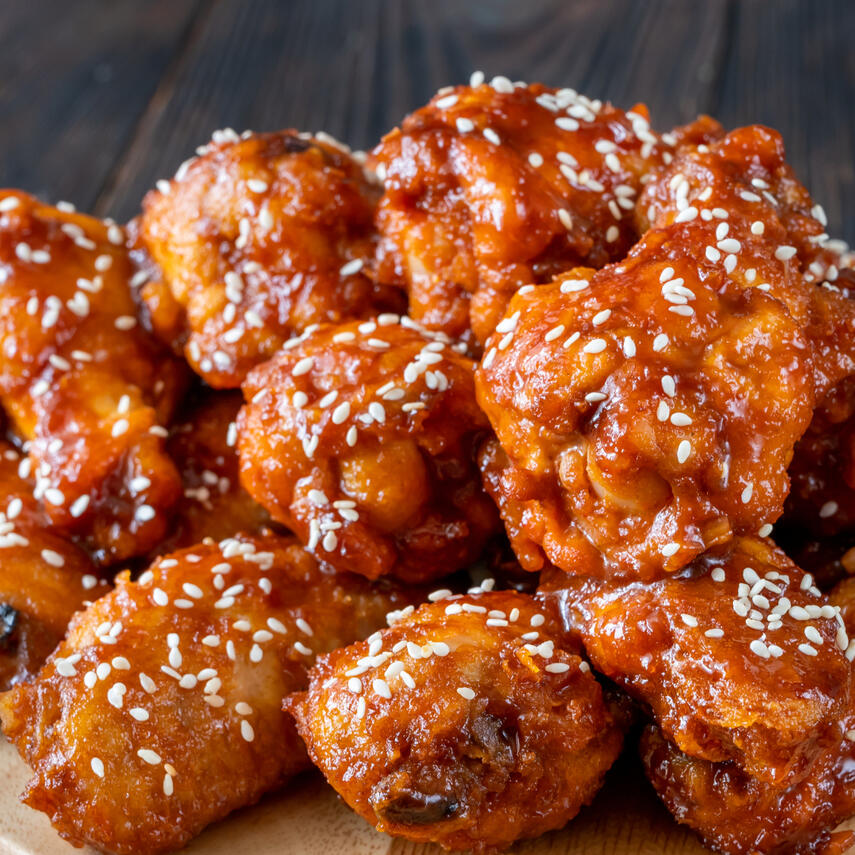 Juicy chicken wings in a Japanese teriyaki glaze, topped with toasted sesame seeds