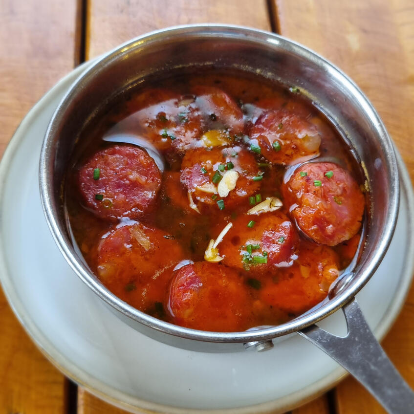 Smoky Monchique chorizo braised in tangy apple cider, served with focaccia bread